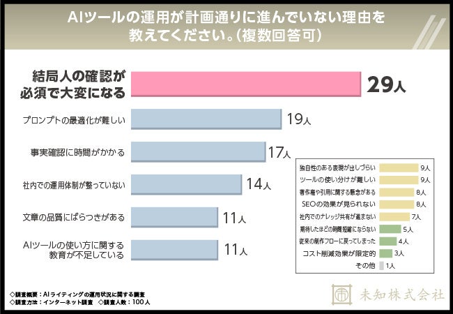 最後に、「AIライティングにおいて、実際のAIツールの運用状況について教えてください」の設問で「当初の計画通り、効果的に運用できている」以外を回答した方に「AIツールの運用が計画通りに進んでいない理由を教えてください。(複数回答可)」と質問したところ、最も多かった回答は「結局人の確認が必須で大変になる」で29人でした。