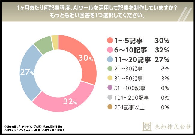 未知株式会社(本社所在地:大阪府大阪市、代表取締役:下方 彩純)は、AIライティングを実施している全国の20〜60代の男女100名を対象に「AIライティングの運用状況」に関する調査を実施しました。