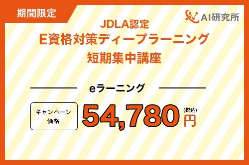 JDLA認定E資格対策ディープラーニング短期集中講座は、eラーニングを通常価格184,800円(税込)のところ、54,780円(税込)でご受講いただける直前割引キャンペーンを行います。