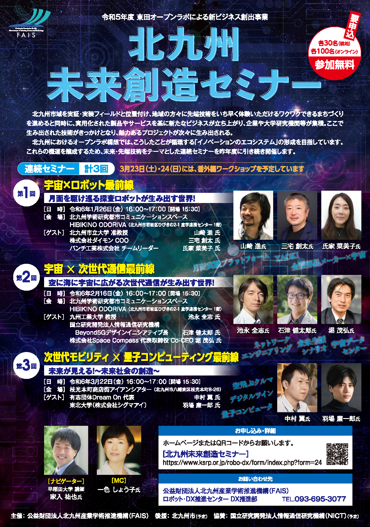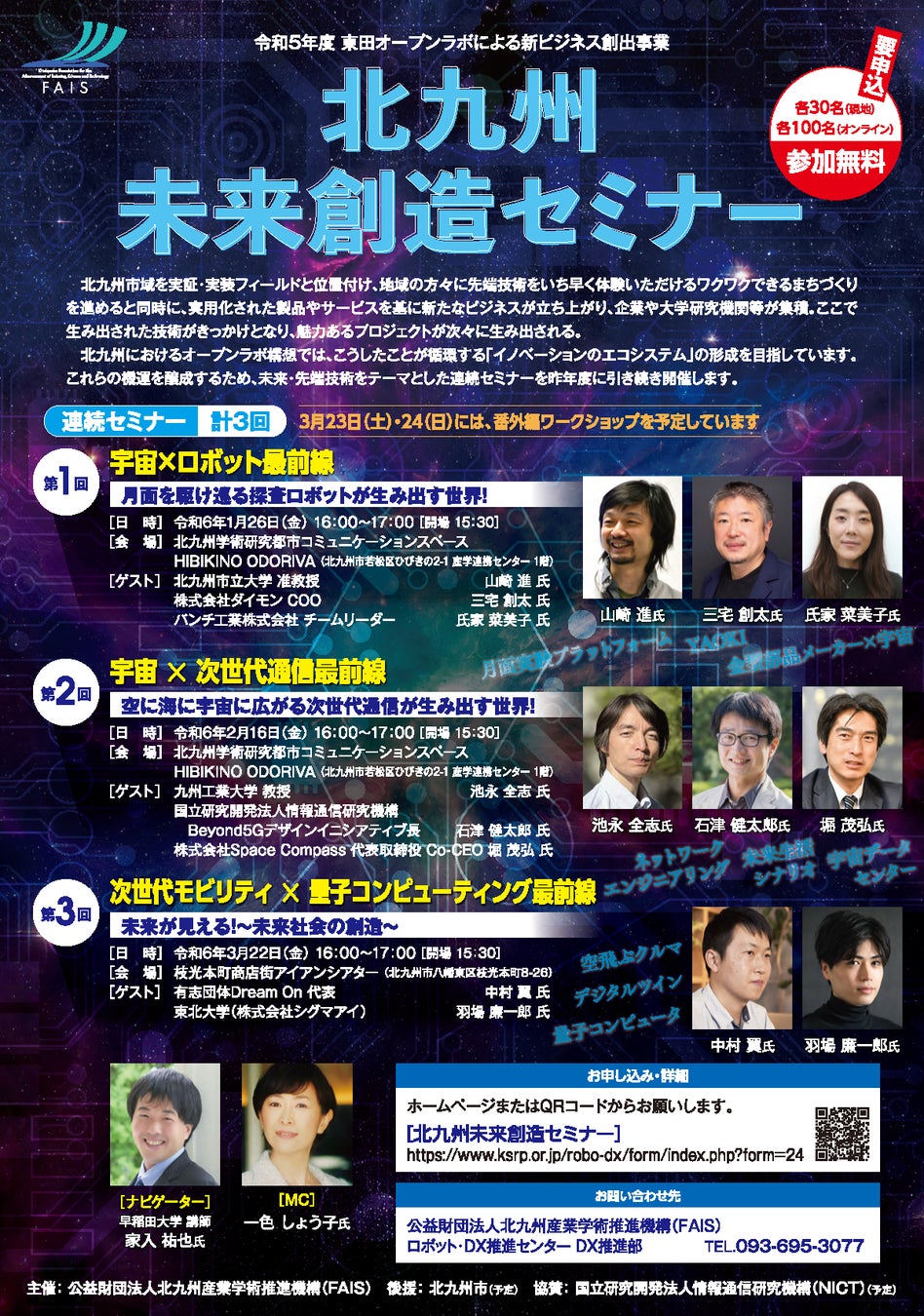 その事業の一環として、北九州市域において、新たなビジネスの誘発、創発することを目的とした次世代・未来技術に関する連続セミナー「北九州未来創造セミナー」を主催しています。