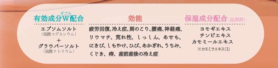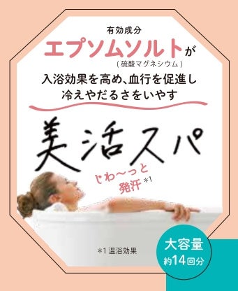有効成分のエプソムソルト(硫酸マグネシウム)が入浴効果を高め、血流を改善し、筋肉の緊張をほぐして症状を和らげ、冷え性や疲労回復に効きます。