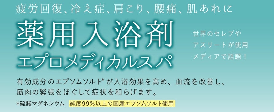 世界のセレブやスポーツ選手たちも大注目!人気沸騰中の話題のエプソムソルト(硫酸マグネシウム)を配合した医薬部外品の薬用入浴剤が新登場。肌あたりのやわらかい、まろやかなお湯が、身体を芯まで温め、疲れてこり固まった身体をやさしくほぐします。