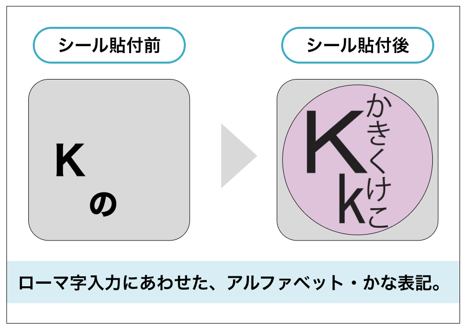 ⺟⾳については、⼀⻫指導で⼀時間かけて⾏いますが、そのあとは⼦⾳との組み合わせであるということを教えます。あとは、個⼈差があるため、⾃⼒で学習する⽅法が必要です。どの指がどの⼦⾳のキーを押さえるかということを「⾃分で」確かめながら操作するためには、⼦⾳を⽰したシールが必要だと思うようになり、このシールのアイディアを思いつきました。