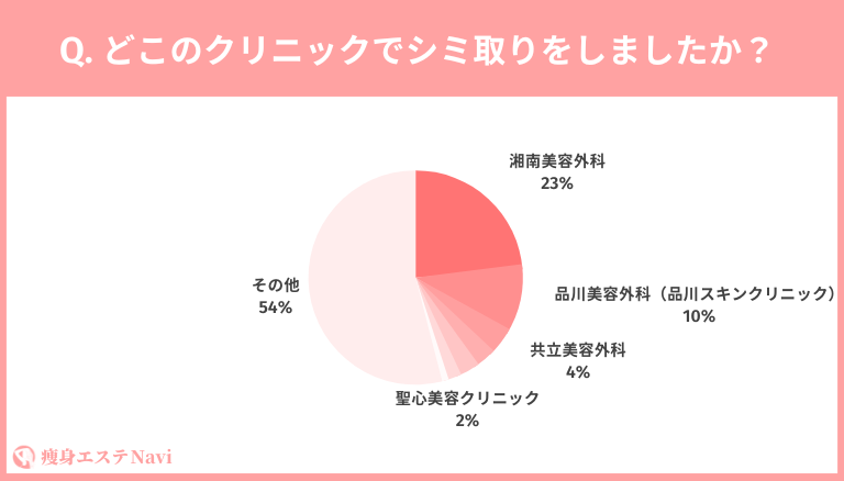 ・シミ取りを受けた人が多いクリニックは「1位:湘南美容外科(23%)」「2位:品川美容外科(10%)」「3位:共立美容外科(3%)」となりました。