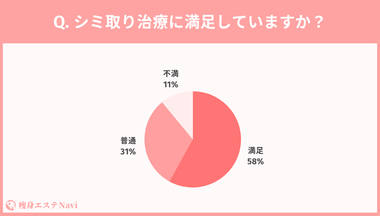 ・シミ取り治療に「満足している」と答えた方は、58%、「普通」と答えた方は31%、「不満」と答えた方は11%となりました。
