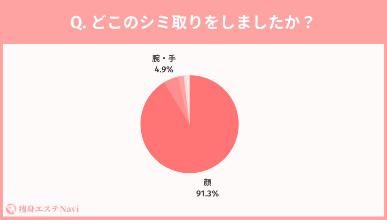 ・施術した人の受けた部位が「1位:顔(91.3%)」「2位:腕・手(4.9%)」「3位:お腹・胸(デコルテ)(2%)」となりました。