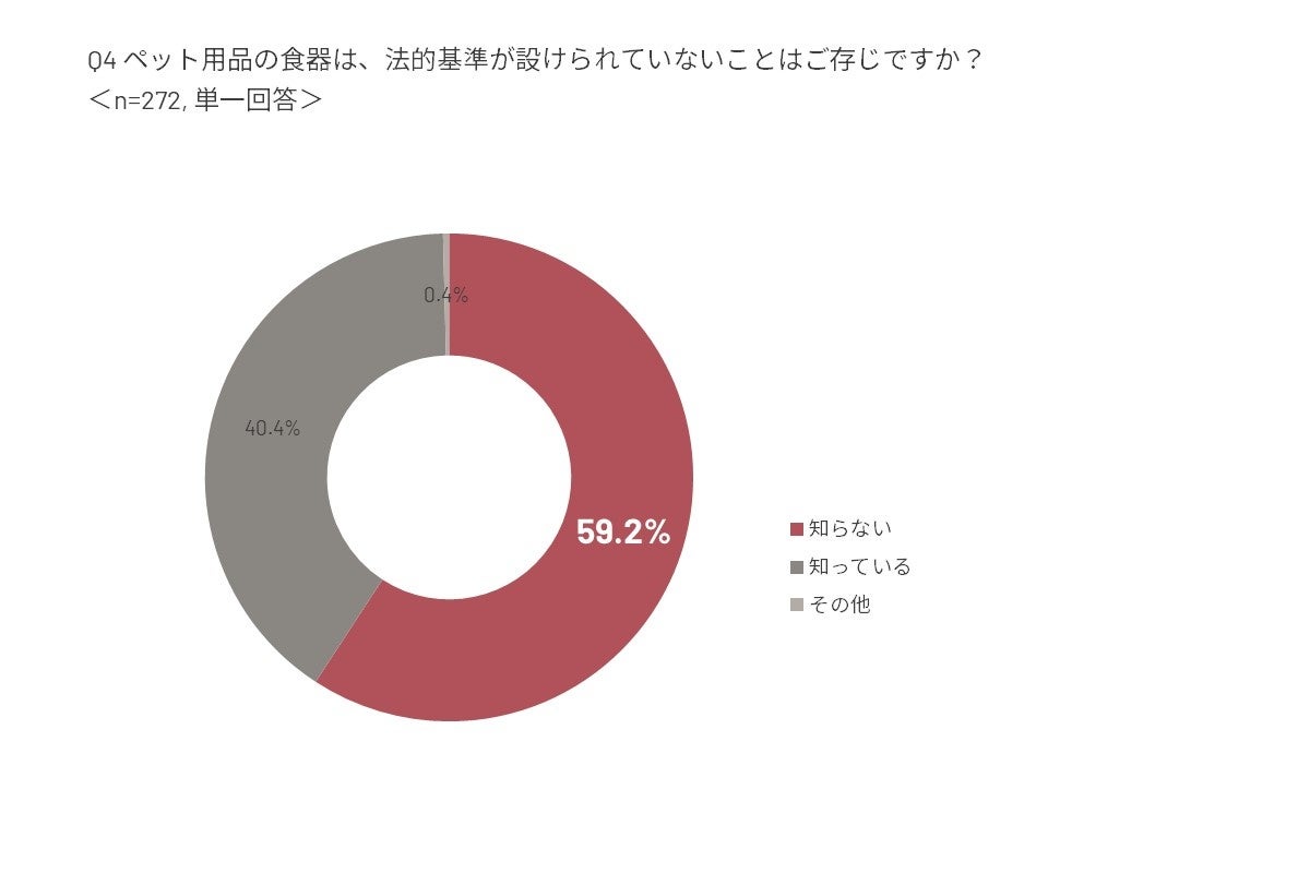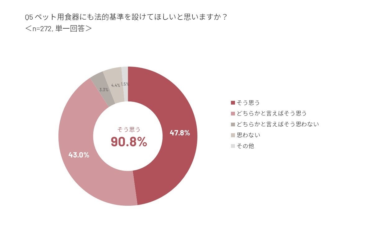 また、「ペット用の食器については、法的基準(※)が設定されていないことを知っているか」という質問に対しては、「知らない」が半数以上を記録。そのうえで、9割以上の回答者が「何らかの法的基準を設けてほしい」と回答をしています。