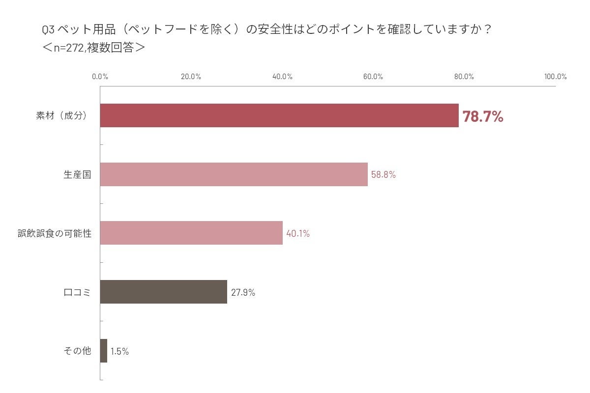 「Q1」でペット用品の選択基準を「安全性」と回答いただいた272名の方を対象に、今度は「“安全性”は何を基準に確認するのか」について質問をしてみました。すると、最も多い回答は「素材(成分)」、次点では「生産国」という結果になりました。