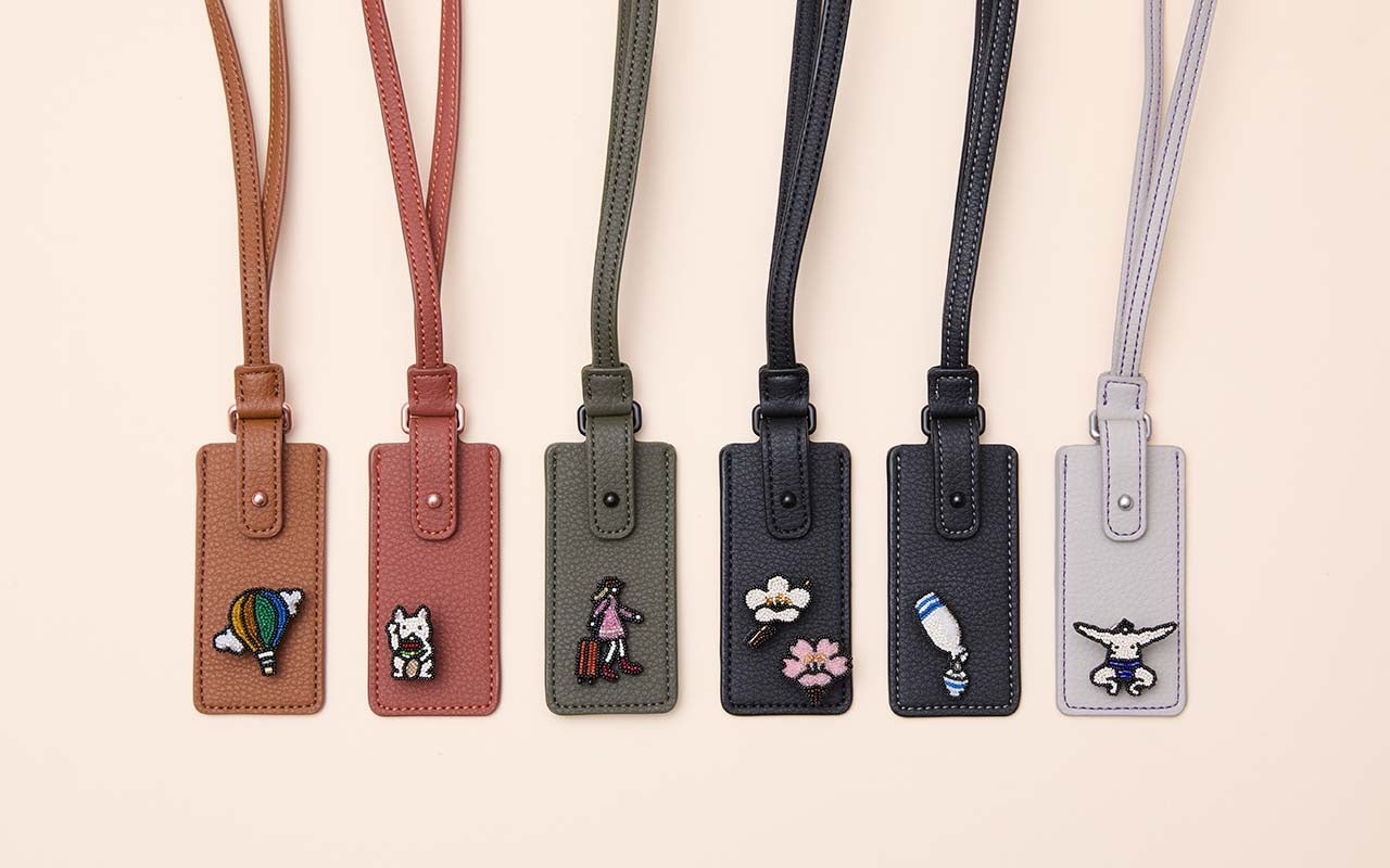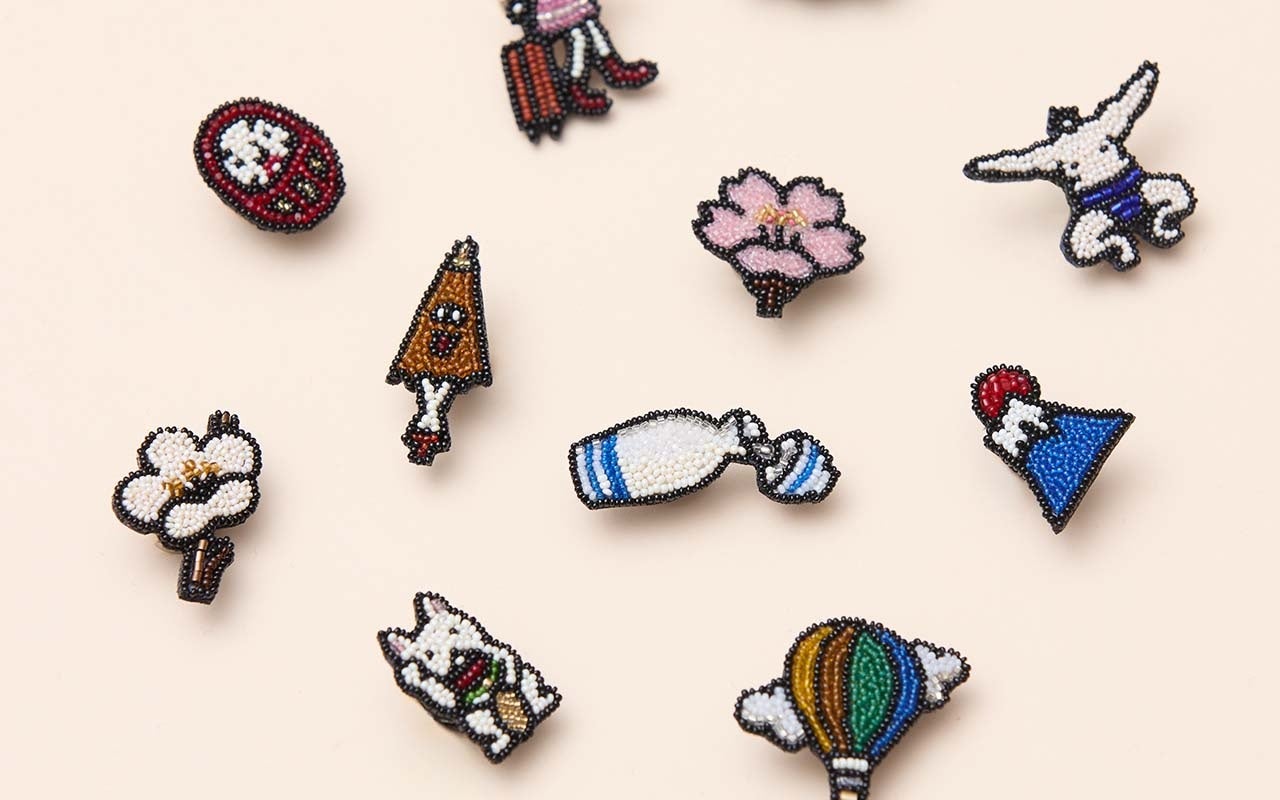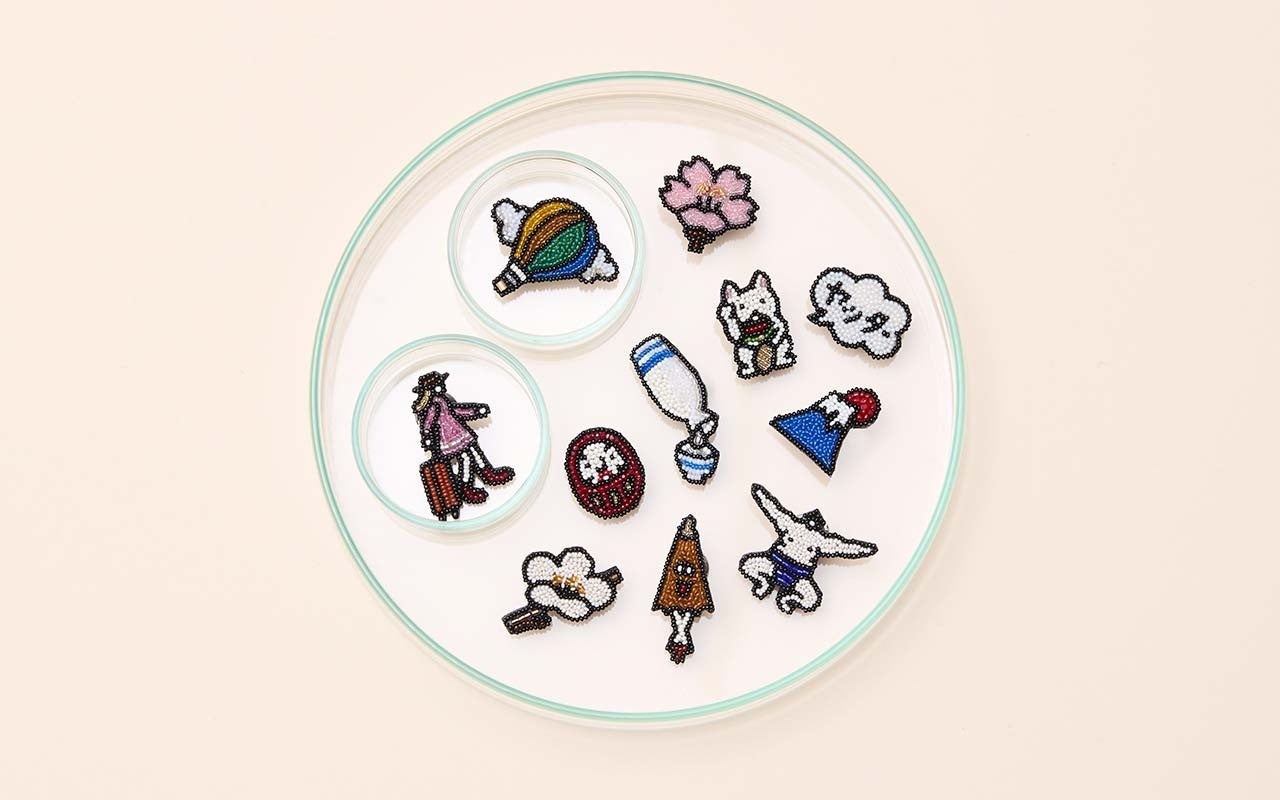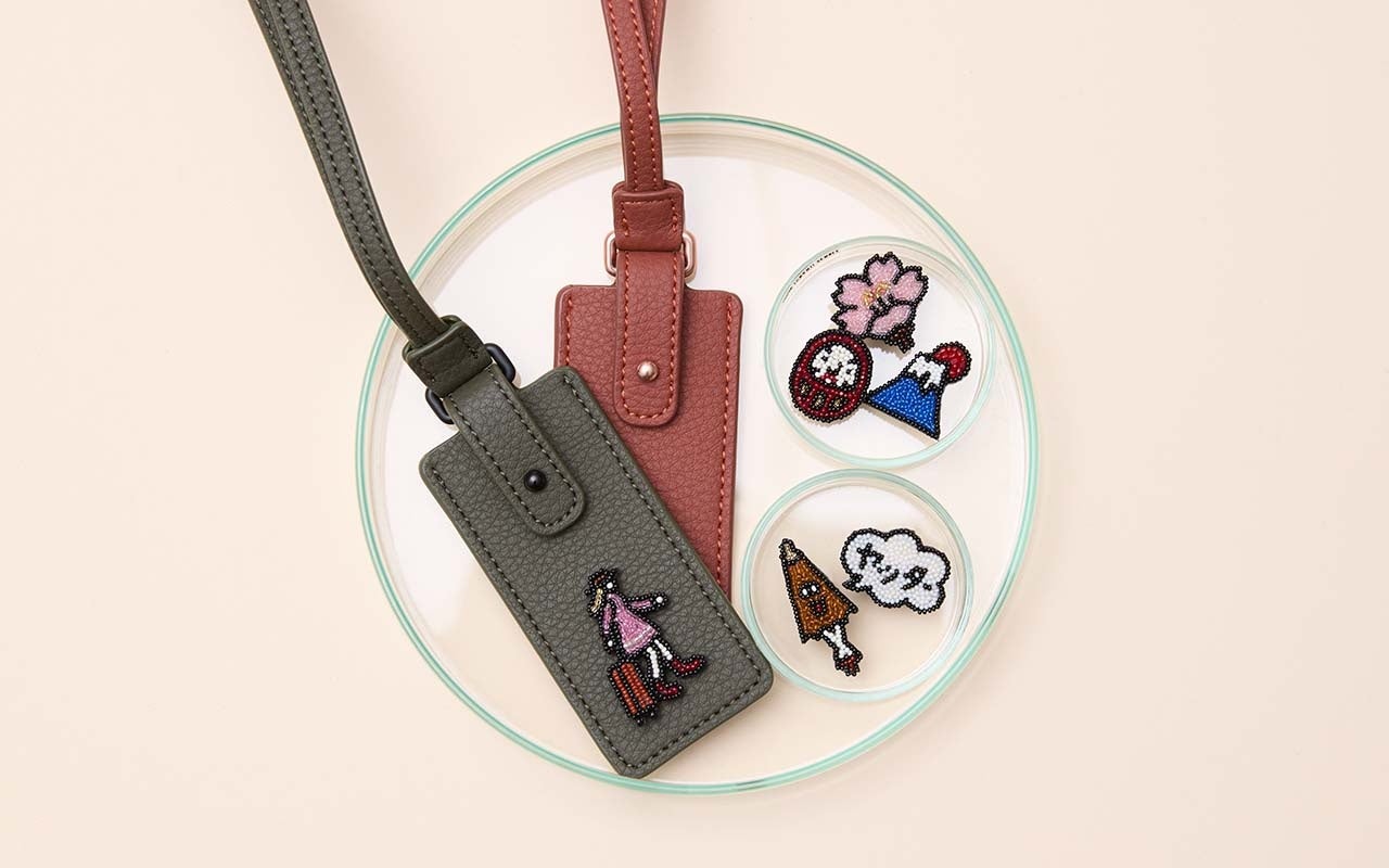 また、ラゲージタグのアクセサリーとして楽しめるPINSは、ビーズ刺繍作家 小林モー子氏によるデザインです。今回は日本の旅をテーマに、日本らしいモチーフをセレクトしました。繊細なビーズで表現されたPINSは、ラゲージタグに自分好みにカスタムしてオリジナルラゲージタグとして使用することが可能。molnのためにデザインされたオリジナル2種に加え、今回のポップアップのために用意した新作2種と小林モー子氏の作品からセレクトしたものを合わせ全11種を展開します。旅先で電車を待っているとき、ホテルでパッキングを解くとき。旅の中のふとした瞬間に、愛着や遊び心を想い起こさせてくれるアクセサリーです。