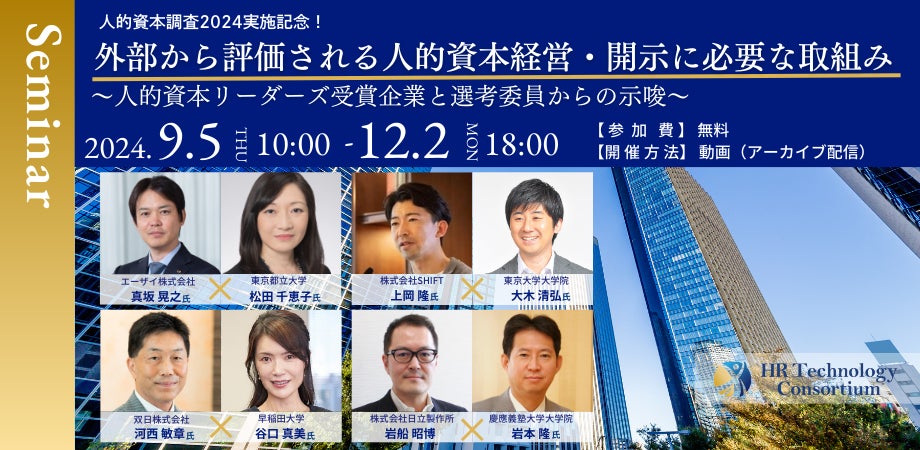 一般社団法人HRテクノロジーコンソーシアム(代表理事:香川憲昭)は、MS&ADインターリスク総研株式会社(社長:一本木真史)、HR総研(ProFuture株式会社/所長:寺澤康介)、及び一般社団法人人的資本と企業価値向上研究会(代表理事:松岡仁)と共同で、人的資本経営と開示に関する企業・団体等の取組状況を大規模調査する「人的資本調査2024」を本年も実施します。また、本調査の実施を記念し、外部から評価される人的資本経営・開示に必要な取組みを紹介するオンラインセミナーを開催します。