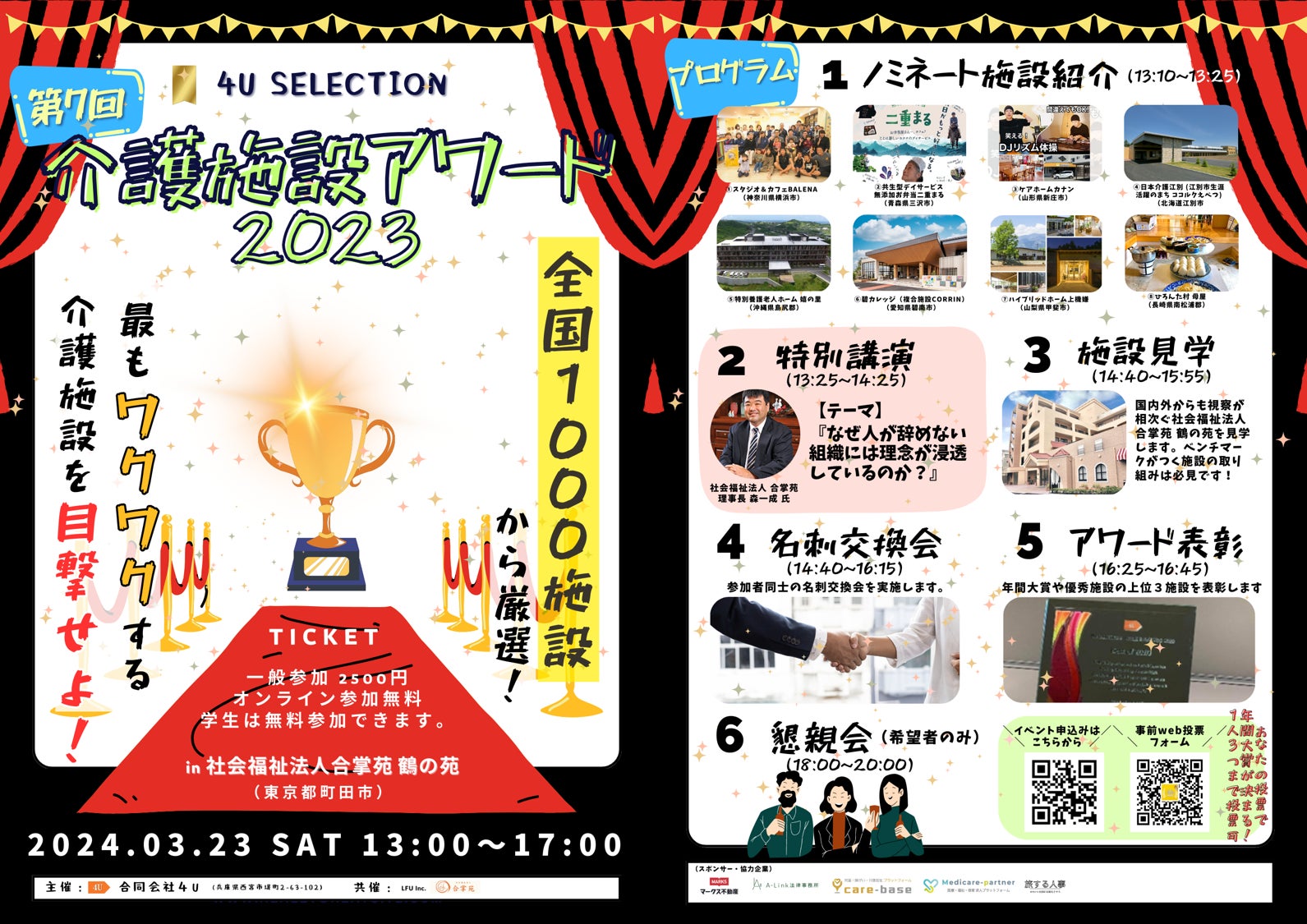 「イノベーション。誰かのために社会を面白くする!」をミッションに全国の介護高齢者施設の見学や施設運営サポートなど行う合同会社4U≪フォーユー≫(兵庫県西宮市、代表:蛯沢渉)は全国1000施設から業界に価値のある施設を表彰する「第7回介護施設アワード2023」を2024年3月23日(土)13時00分から社会福祉法人合掌苑 鶴の苑(東京都町田市)の現地、オンラインのハイブリッド開催することをお知らせします。