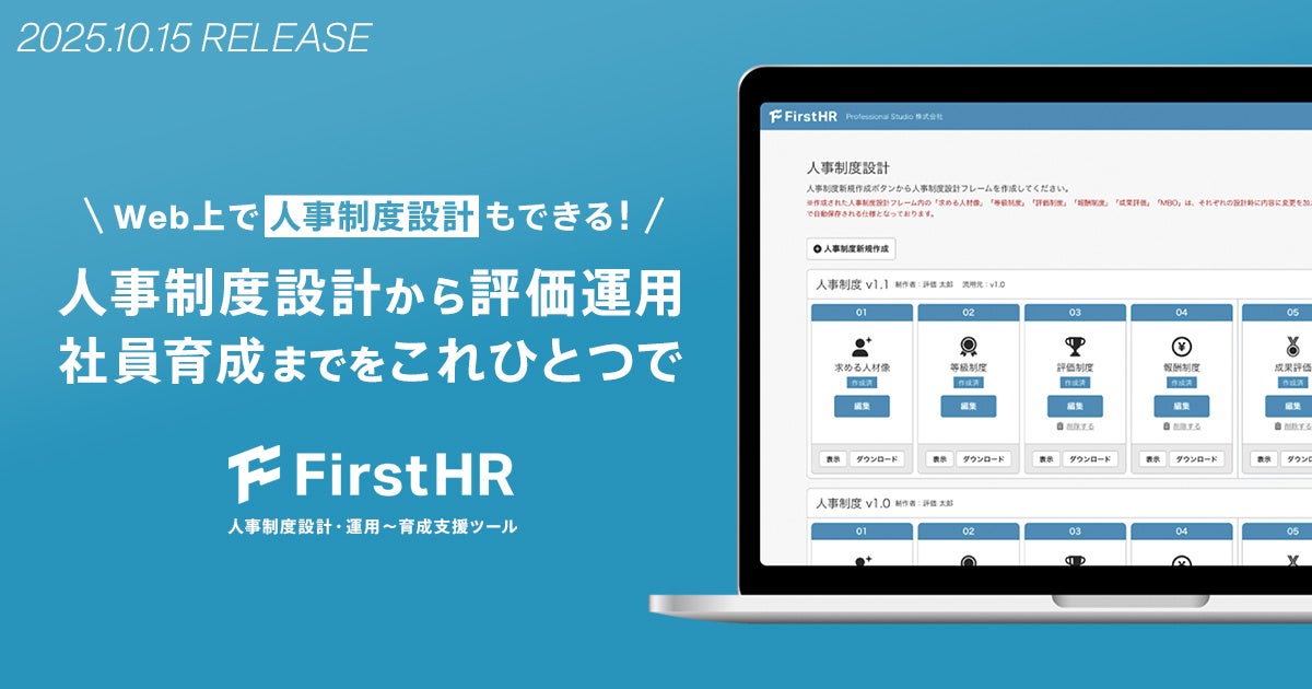 Professional Studio株式会社(本社:東京都中央区、代表取締役:市川龍太郎)は、Web上で人事制度設計から評価運用、さらに評価基準に連動した社員育成も実現できる「FirstHR」を2025年10月15日に正式リリースいたしました。