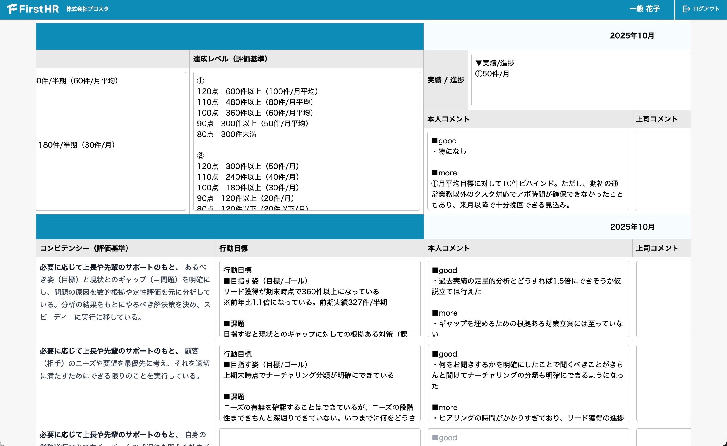 評価基準にもとづいた育成をFirstHR上での人事制度設計後に自動生成される『月次面談シート』によって実現できます。