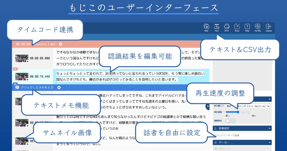 「もじこ」は、どんなに技術が進歩しても音声認識率が100%ではないことに着目し、人力での文字起こしの労力を最小限に抑えるために開発されたエディタです。