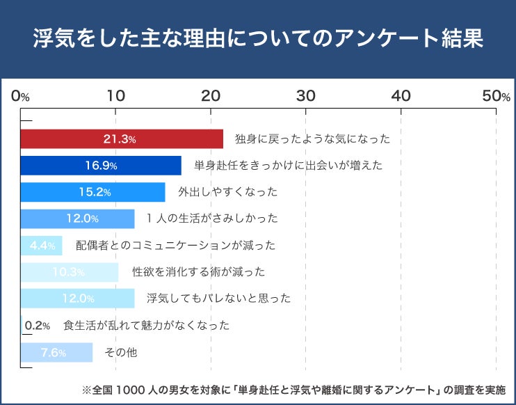 単身赴任中に浮気をした理由で一番多いのは、「独身に戻ったような気になった」でした。