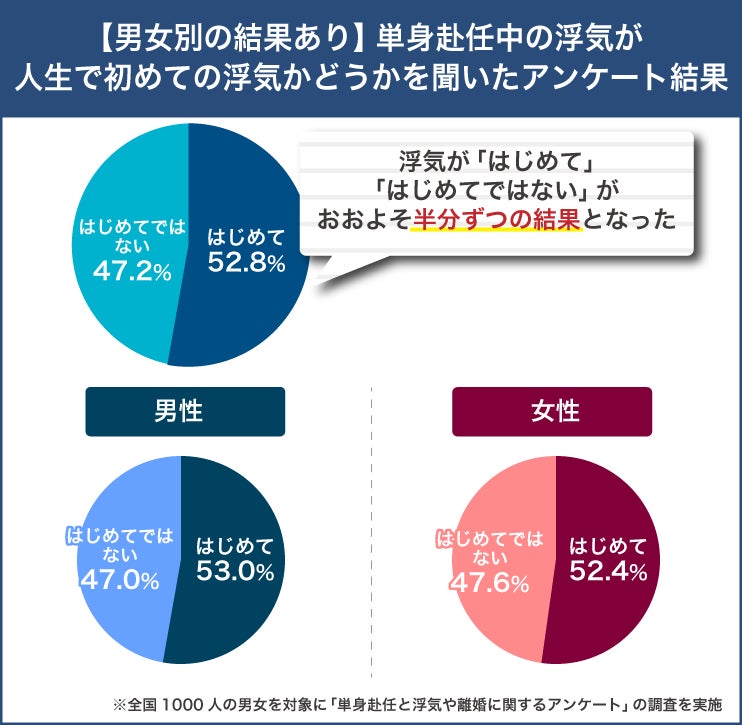 単身赴任中にした浮気が人生で初めての浮気になった人は約半数