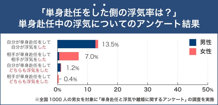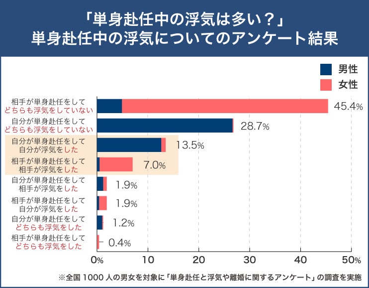 一般的に男性が単身赴任をするケースが多いため、男性では「自分が単身赴任」をしている間の浮気が、女性では「相手が単身赴任」をしている間の浮気が多くなる傾向が分かりました。
