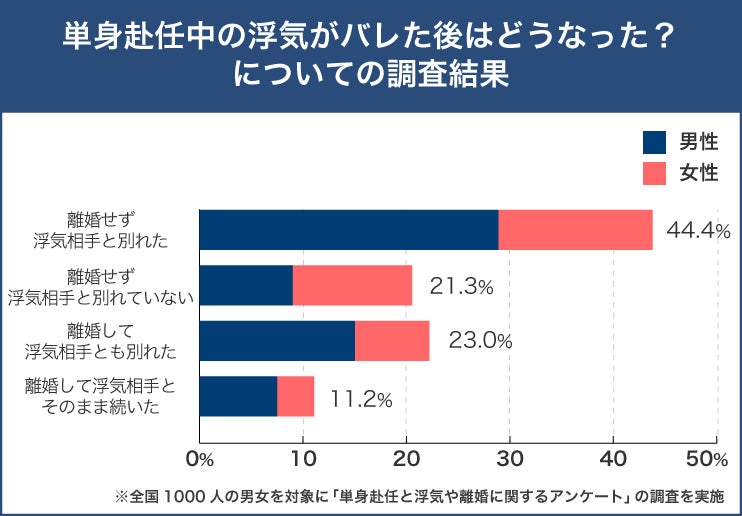 一方、離婚をした・していないにかかわらず単身赴任中の浮気がバレた後どうなったかについては、「離婚せず浮気相手と別れた」が44.4%、「離婚せず浮気相手とも別れていない」が21.3%と、離婚を選ばなかった人が65.7%いると分かりました。