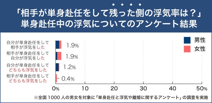 男女別で見ると、男性では「自分が単身赴任をして相手が浮気をした」が一番多く2.5%、女性は「相手が単身赴任をして自分が浮気をした」が2.8%で1位です。