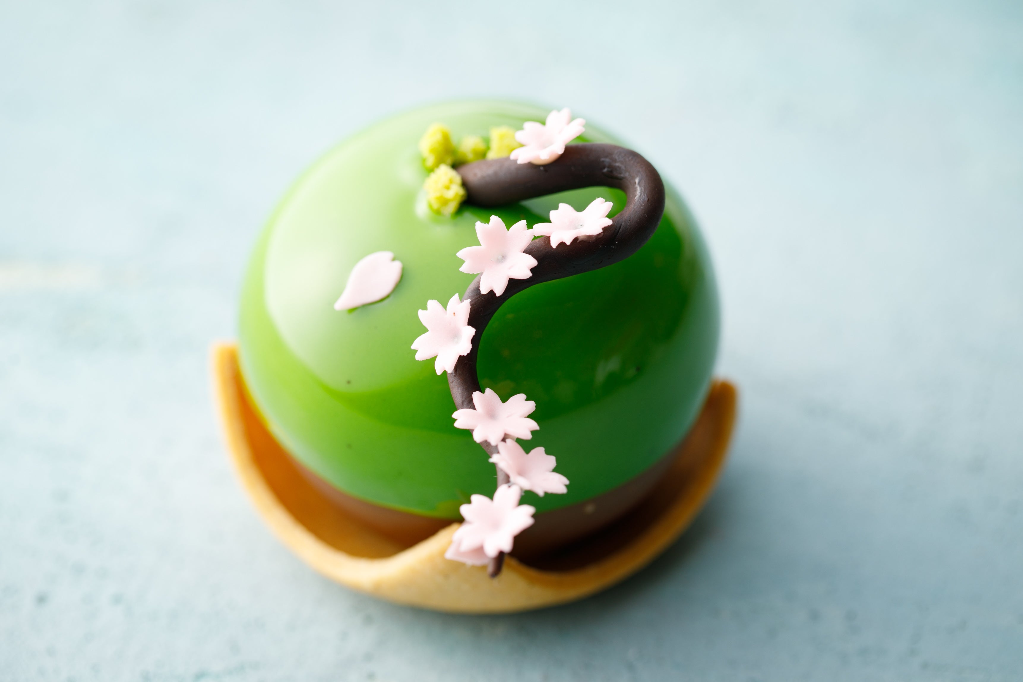 日本の美しい春と盆栽を表現したケーキです。ピスタチオのムースとラズベリー&桜のゼリー、ラズベリー&桜のクリームをチョコレートでコーティングした季節感あふれる味わいです。