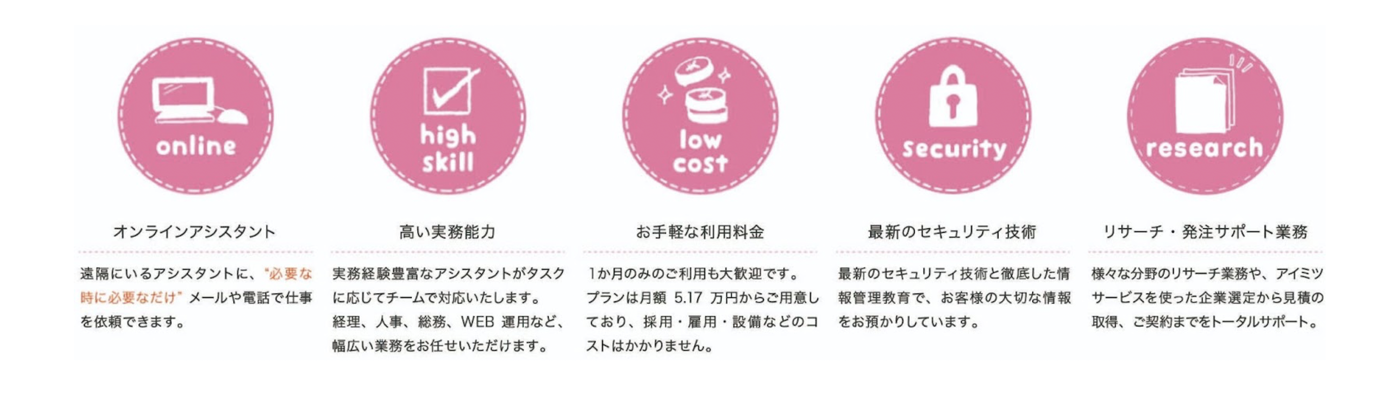 経理・人事労務・総務など各企業のベースとなる事務作業から、Webデザイン・サイト運営、翻訳、コール業務など、幅広いご依頼が可能です。さらに書類の整理や、紙ファイルの作成などオフライン業務にも対応し、今後もリクエストに応じた作業依頼に柔軟に対応できるよう、サービスの拡大を予定しております。