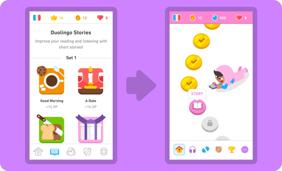 「ストーリー」があるコースの場合:短いストーリーの中で言語学習ができる「ストーリー」を学習ルート内に組み込み、別のタブへ移動する必要をなくしました。