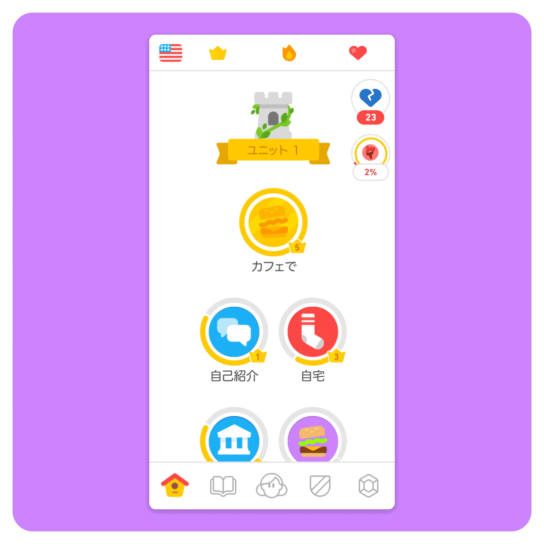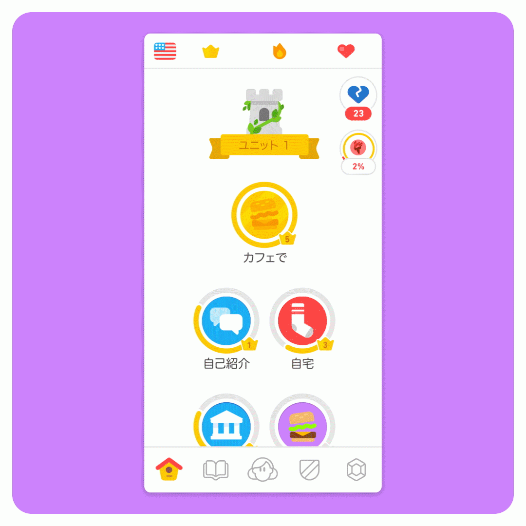 学習ルート上に存在する円状のアイコンがそれぞれ1つのレベルとなっており、1つのレベルをクリアすると、変更前のホーム画面における1つのスキルで1つのクラウンを獲得したレベルに相当します。