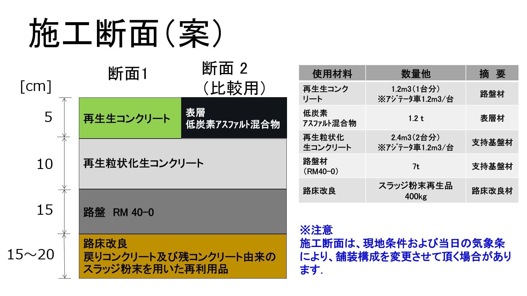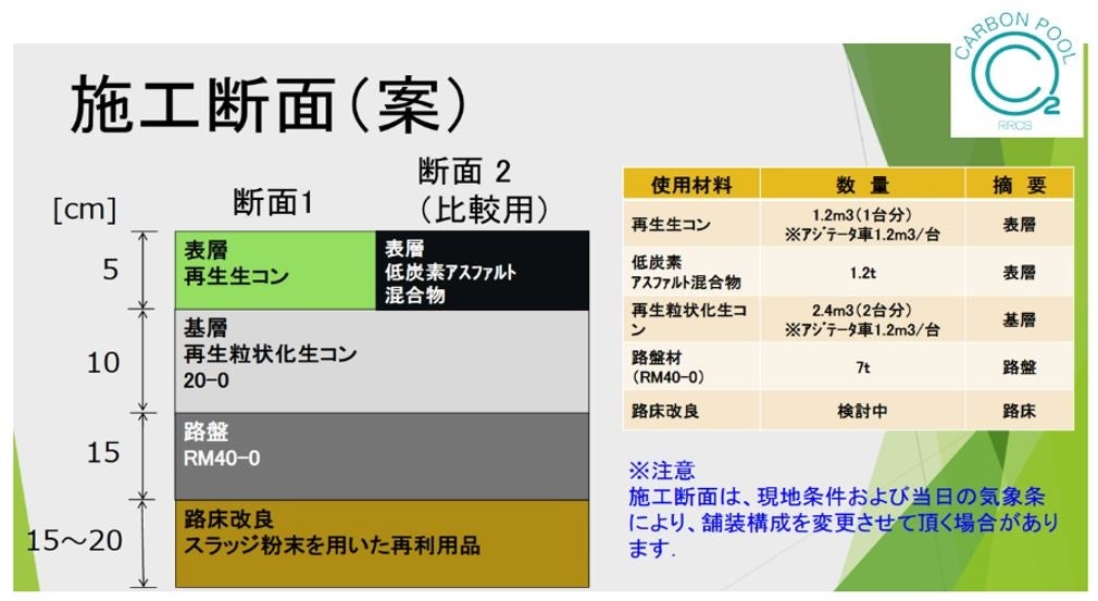 試験施工では、下記の施工断面図の緑色部「再生生コン」の生コンクリートは、(株) 安藤ハザマ・筑波研究所にて現時点でCO2を最大固定化させた骨材から製造し、舗装施行します。また、その隣の黒色部「表層・低炭素アスファルト混合物」は今回のグリーンイノベーション基金事業プロジェクトのスコープ外なのですが、東京都が自治体として初めて認可した低炭素型のアスファルトで舗装するという、脱炭素舗装技術に向けた最初の一歩の試験施工となるでしょう。