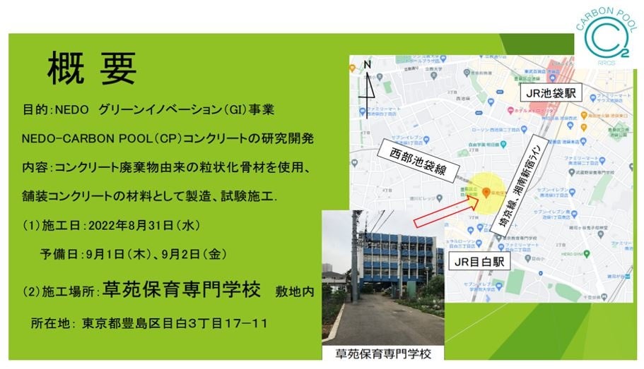 今年からはじまった10年間の研究開発プロジェクトで、右上図にある「炭酸化粒状化骨材」の性能見極めの一環として、あくまでプレ・プロトタイプながら試験施工を実施致します。スペースをご提供頂いたのは、内山アドバンスの社長が理事を務める東京都豊島区・草苑学園で、日頃は学生・園児の集うスペースをお借りして、まさにこの子供たちの将来の為に最重要課題として取り組むべきであろう脱炭素社会の実現に向けて、初期試験施工を身近に感じて頂きたいです。