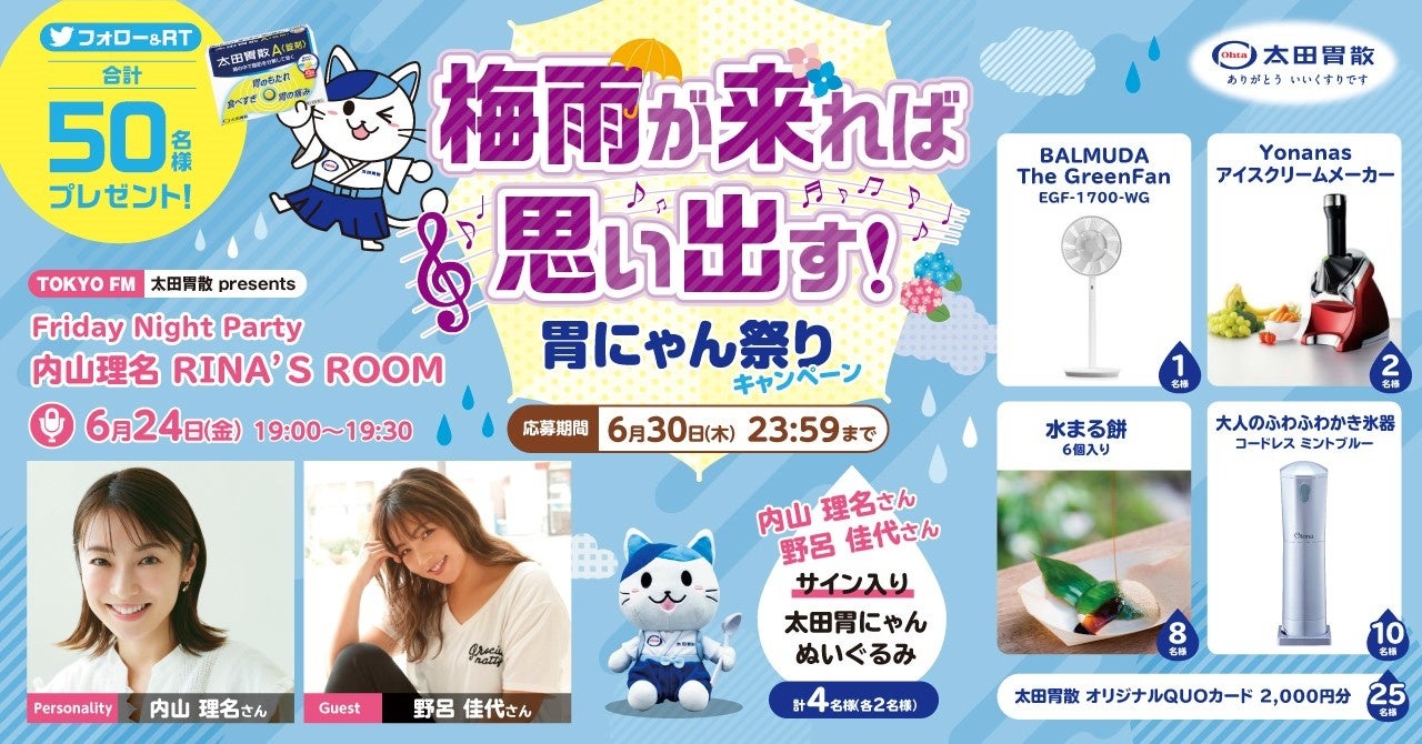 本キャンペーンは同社が提供しているTOKYO FM1ヶ月間限定プログラム『太田胃散 presents Friday Night Party 内山理名 RINA’S ROOM』(6月パーソナリティ:内山理名さん 毎週金曜日19:00~OA)とのコラボ企画となっておりますので、ぜひ番組もお聴きください