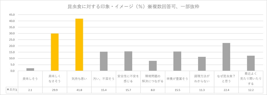 タンパク質危機に対する有効な解決手段の1つとしてFAOの提唱する昆虫食ですが、全体の82.0%が「知っている・聞いたことがある」と回答し、国内における知名度の高さがうかがえる結果となりました。その一方で昆虫食に対する印象・イメージを問う設問では41.8%が「気持ち悪い」29.9%が「美味しくなさそう」と回答し、食品としての一般普及には及ばない状況だと判明しました。
