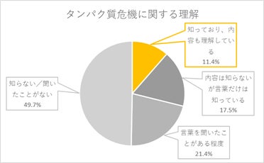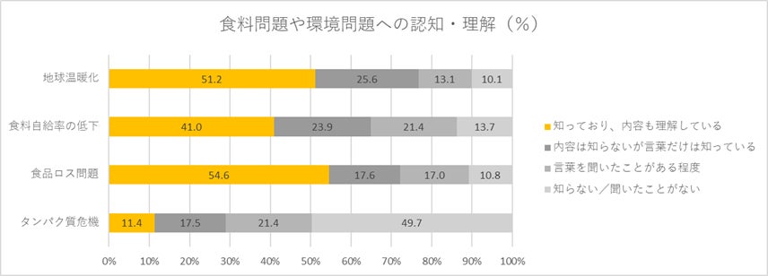 タンパク質危機への理解を尋ねる設問に対して、「知っており、内容も理解している」と回答した方は全体の11.4%でした。この数字は地球温暖化や食品ロス問題といった他の環境問題・食料問題と比較しても圧倒的に低く、国内におけるタンパク質危機の啓発不足が露呈する結果となりました。