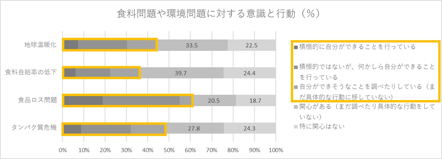 一方でタンパク質危機に対して「知っており、内容も理解している」「内容は知らないが言葉だけは知っている」「言葉を聞いたことがある程度」と回答した方503名を対象に、タンパク質危機に対する意識と行動を尋ねた設問では、47.9%の方が検索以上の行動をとっていると回答しました。この割合は他の社会課題と比較しても遜色ない数字であり、課題を認知した方の約半数が何らかの行動をとっていると判明。タンパク質危機の認知普及が日本における喫緊の課題であることが分かる結果となりました。