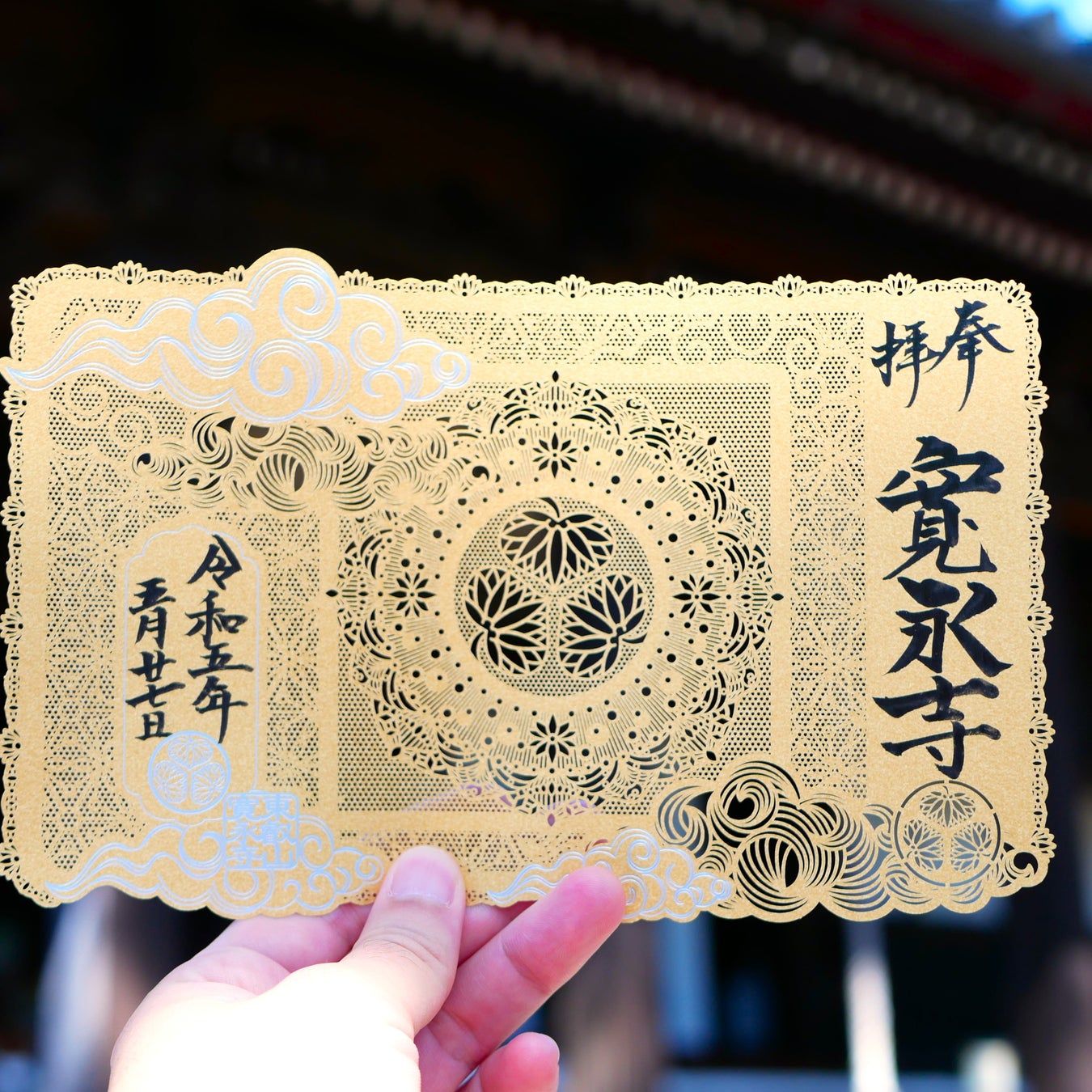 この切り絵御朱印の最大の特徴は、徳川家の象徴とも言える葵の御紋を全面にあしらったデザインです。最初に目に飛び込んでくるのは、真ん中に位置した細やかでインパクトのある切り絵の御紋。左右にも御紋が散りばめられ、その内の1つは、縁起の良い雲のモチーフと共にシルバーの箔押しで表現されています。寛永寺の中心的お堂である根本中堂のイメージそのままに、ゴールドの重厚な紙の中に繊細な切り絵が施されています。ゴールドとシルバーの箔押しコントラストにもご注目ください。