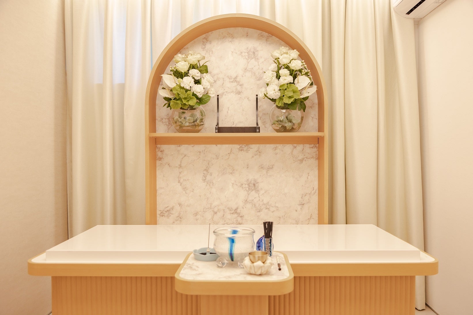 『ソライエ』のコンセプトは、「故人様を宙(そら)、すなわち天国へあたたかく見送るための家」。そのコンセプトの通り、白とウッドのモダンスタイルでデザインされた内観は温もりがあり、自宅にいるような感覚で故人様をお見送りすることができます。『ソライエ武里』は他のソライエと同様、商業施設だった建物を活かした作りになっており、1日1件の貸切り専用で、安心・安全にご葬儀を執り行えるように対策も十分に行っております。そして『ソライエ武里』は、施設見学や故人様へのご焼香など、受付や体験が無人化対応となる葬斎施設です。