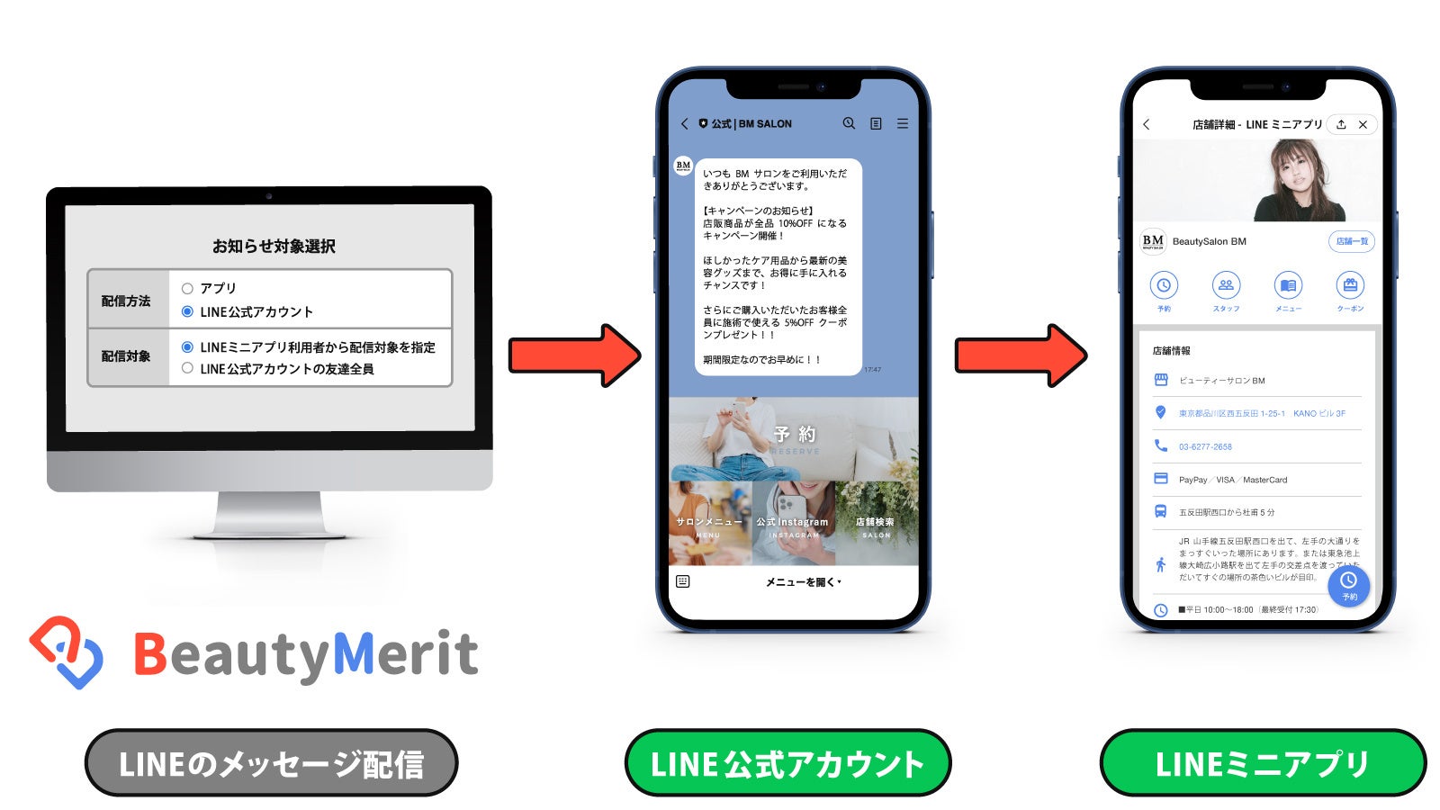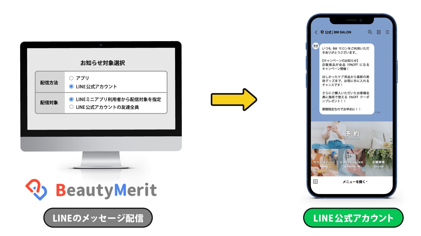 本機能は、LINEで予約を受け付けてBeautyMeritで予約管理ができる便利なLINEミニアプリに加えて、友だち追加をしてくれたお客様とメッセージができるLINE公式アカウントに、BeautyMeritからメッセージ配信ができるようになりました。BeautyMeritの管理画面からLINEのメッセージ配信が利用できるようになることで、「業務の効率化」「LINEのメッセージ配信を使用した的確なアプローチ」を実現します。