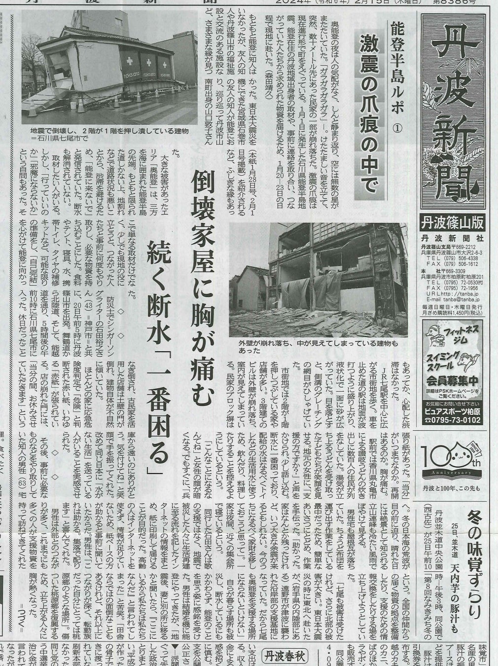 ・記事の内容:今年1月1日に発生した「石川県能登半島地震」。遠く兵庫県丹波市の地域紙の記者が、能登在住の丹波地域出身者への取材や、事前に連絡を取り合いつながっていた人たちから求められた物資を届けるために、現地入りして書いた渾身のルポ。