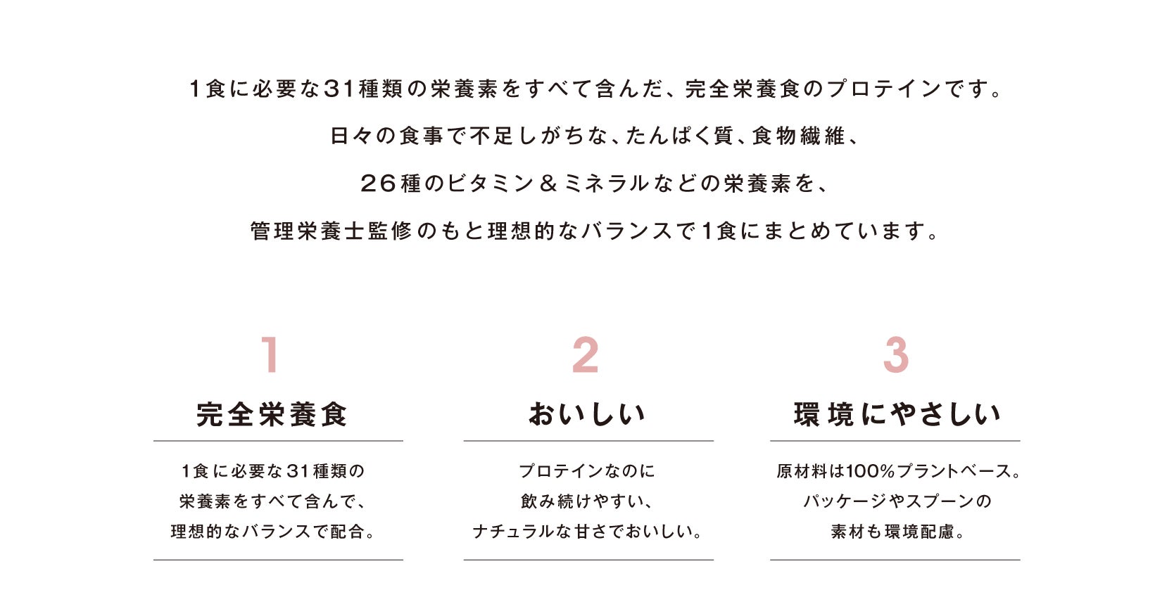 低糖質・低カロリーなので、忙しい時の栄養豊富な朝ごはん、手軽な栄養補給、ダイエット時の1食の置き換えにもオススメです。毎日必要な栄養をすべて摂りながら、健康的でキレイなカラダが目指せます。また、100%プラントベースとして32種類すべての原材料には、肉・魚・卵・乳製品・はちみつなどの動物由来のものを一切含みません。