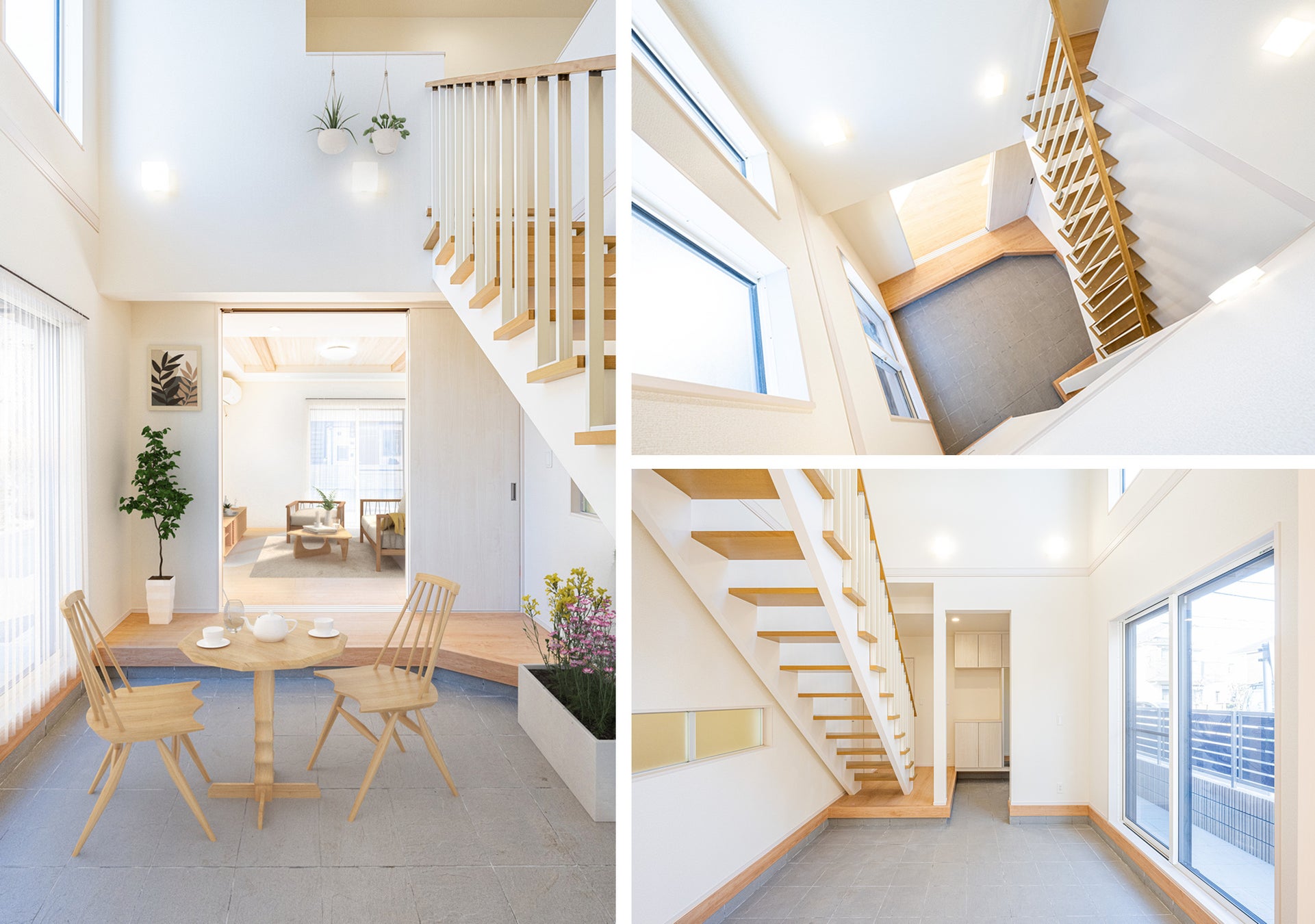 リビングと繋がりを持たせた「マルチエントランス ikoi」は他の仕様と組み合わせることでさらなる魅力を発揮します。吹抜けとデザイン階段を組み合わせることで開放感はより高く、上部から降り注ぐ自然光によってリビングまで優しい光が届きます。好みの観葉植物や絵を飾り、インナーテラスとしてティータイムを楽しむのも良いでしょう。