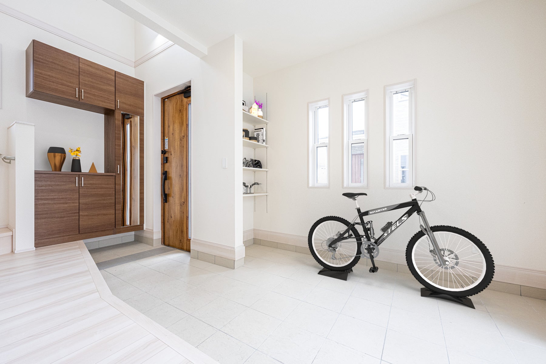 玄関横の土間空間で読書やテレワーク。リビングを仕切っている引戸を開けてペットとの遊び場。窓を開け、庭と一体感を持たせたガーデニング。雨が降って外に行けない日もお子さまと三輪車や砂場キッドで外遊び。玄関一体型の広いエントランスで自転車の整備。キャンプ・ゴルフ用品の保管。物干しや棚を取り付けてDIYでも使いやすさ・収納力がUP。洋室、和室と繋げてリビングとは違ったくつろぎの場にも最適です。