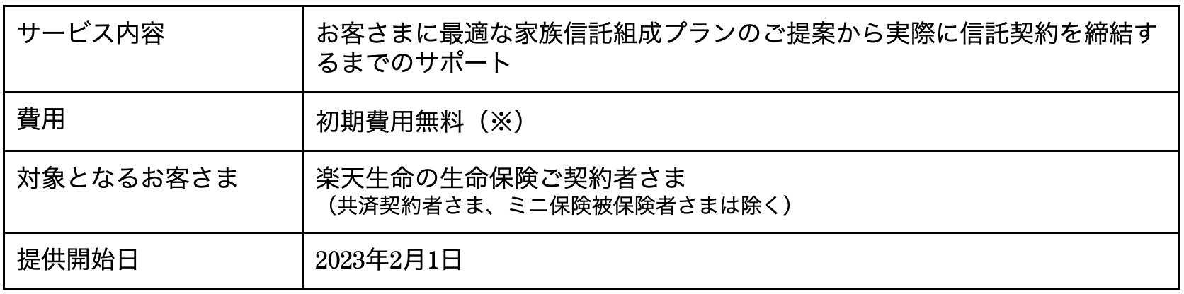 「家族信託」サービスを提供する株式会社ファミトラ(以下「ファミトラ」)は、提携先の楽天生命保険株式会社(以下「楽天生命」)が、ファミトラの「家族信託組成サポートサービス」を、新たな付帯サービスとして初期費用無料(※)で提供開始<2023年2月1日より>しましたのでお知らせ致します。