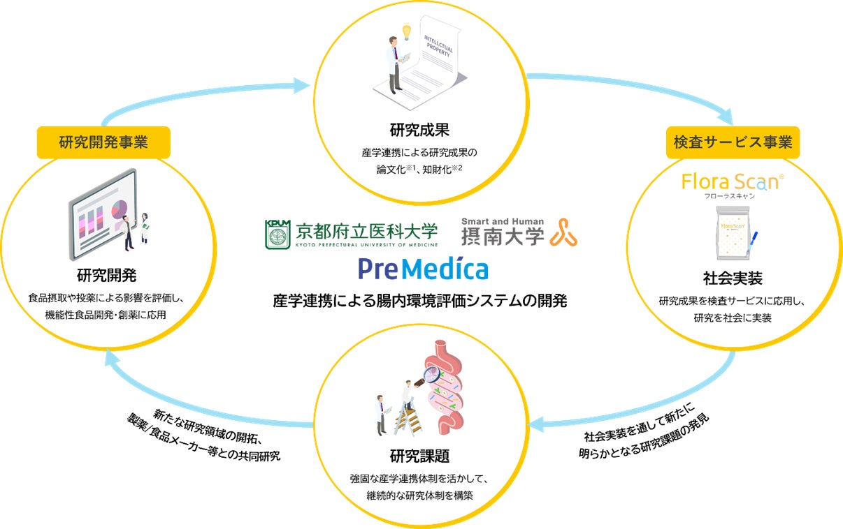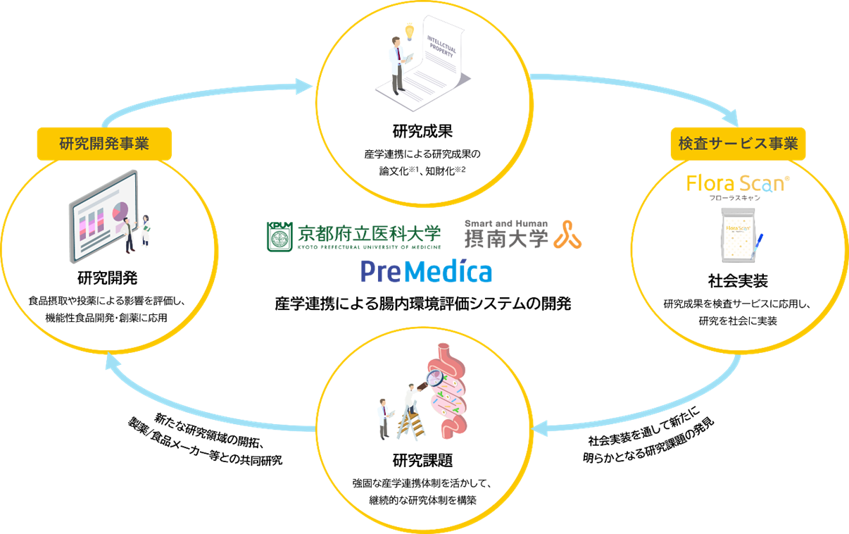 本デザインによる産学連携体制は一時的なものではなく、継続的な共同研究を前提としており、腸内環境評価システムの継続的なアップデートを目指しています。京都府立医科大学、摂南大学による継続的な研究により新たなエビデンスを構築し、プリメディカによって研究成果の社会実装(≒事業化)を推進します。
