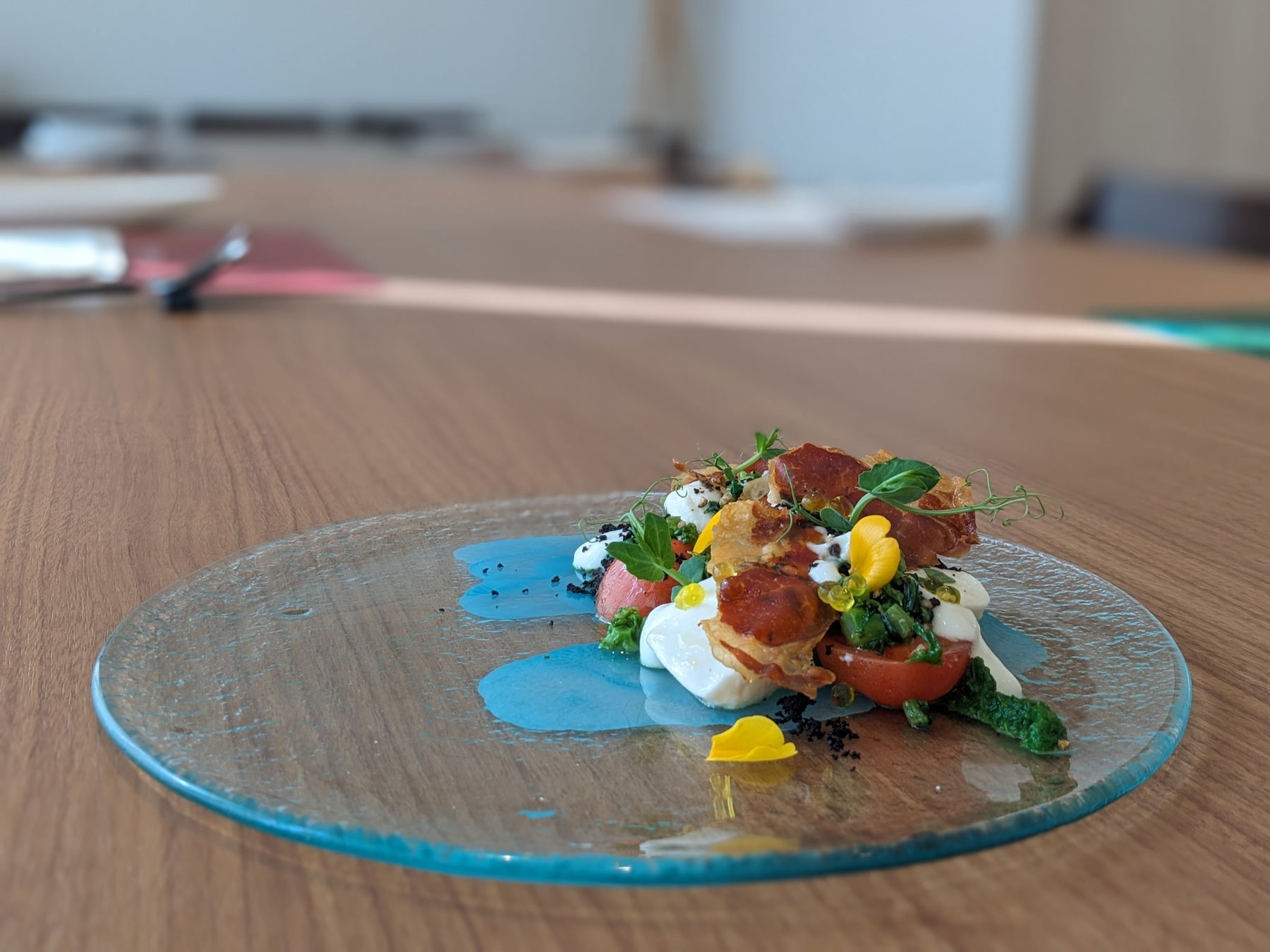 前菜:ジーマーミ豆腐と宮城県産トマト 石巻茂木家ファクトリーの牛乳から作った自家製リコッタチーズのサラダ仕立て