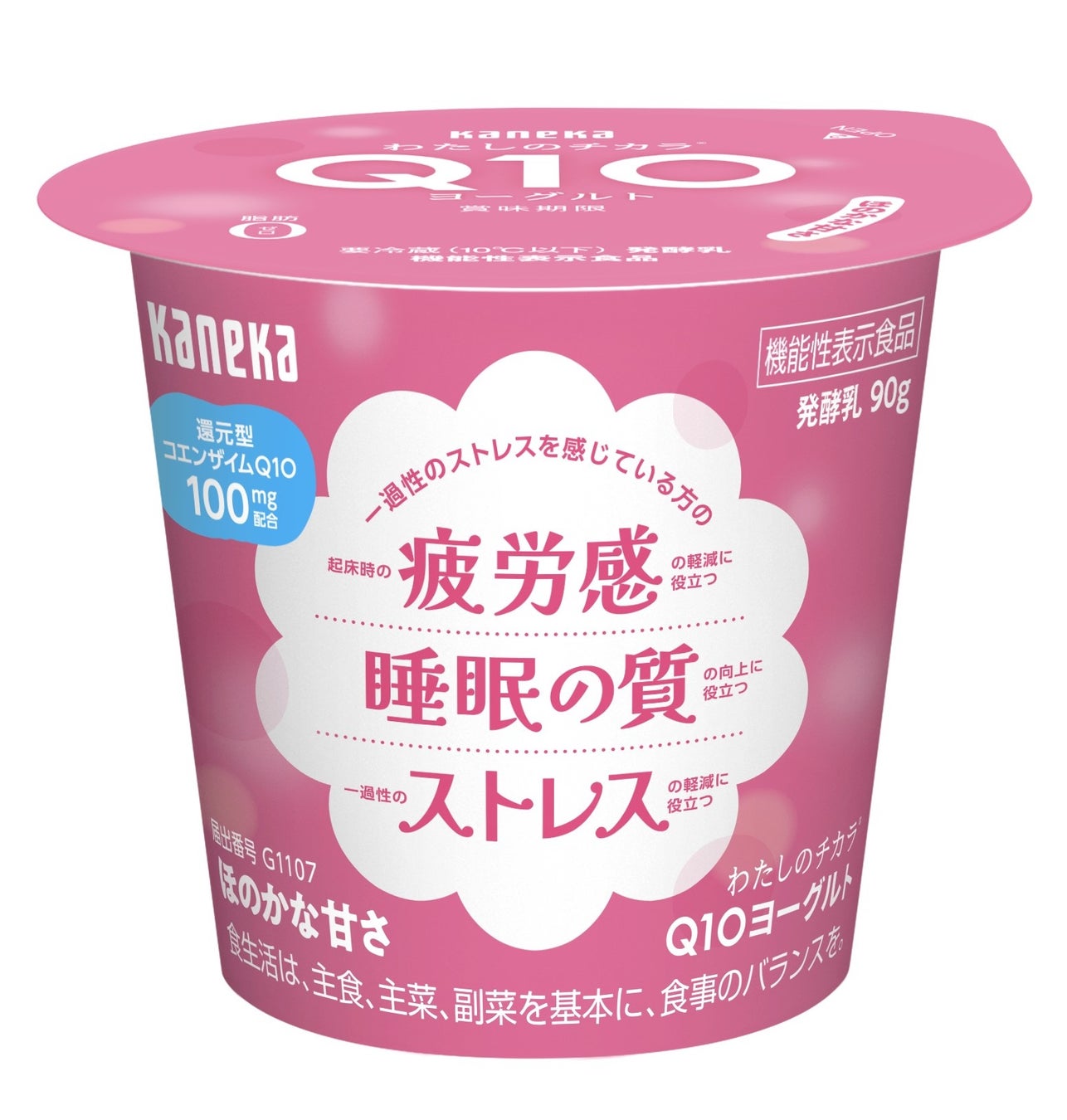 カネカ わたしの力®Q10ヨーグルトには還元型コエンザイムQ10が100mg含まれいます。一過性のストレスを感じている方の「睡眠の質の向上(ぐっすり眠れること、眠りが深いこと、睡眠中に目が覚めないことなど)」「起床時の疲労感の軽減」「一過性のストレスの軽減」に役立ちます。(日本)