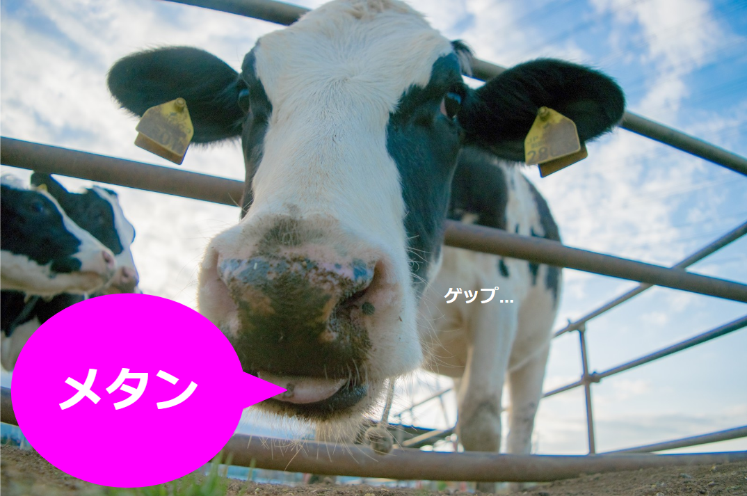 現在、日本のメタン排出量は、二酸化炭素換算で2,839万トンであり、このうち牛のげっぷに由来するものは763万トン、27%を占めます。※2