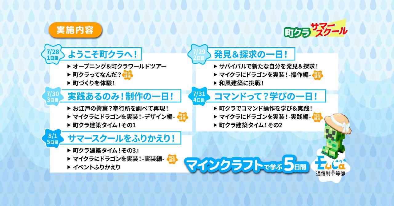 EuLa通信制中等部は、2025年7月下旬にマインクラフトを活用した探究型学習プログラム「町クラ(まちクラフト)」のオンライン体験会を1週間かけて開催いたします。