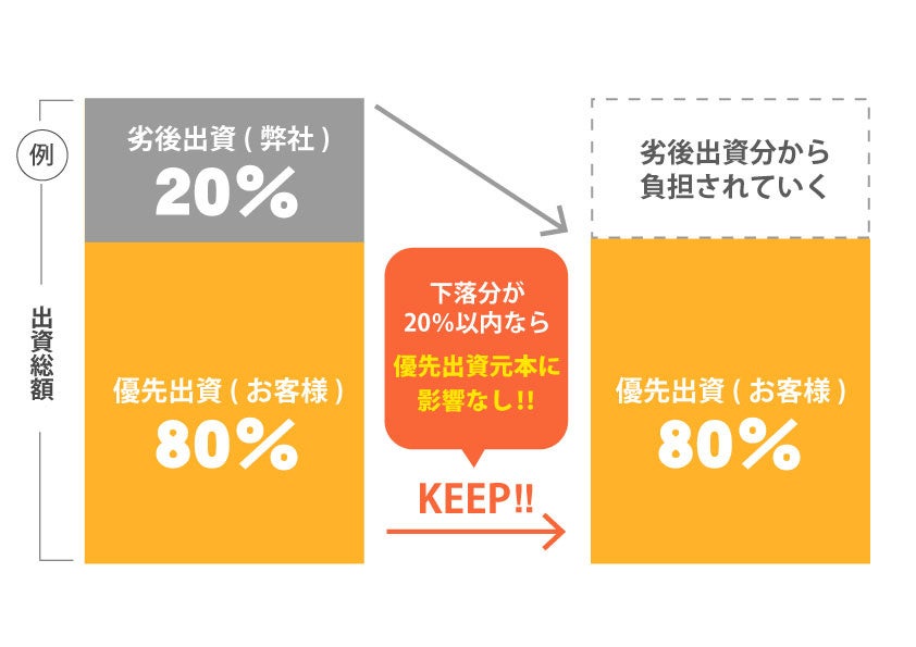 ※劣後出資分でカバーできなかった場合、優先出資者も損失を被ることになりますので、元本保証をお約束するものではございません。(出資法により元本の保証は禁じられています。)