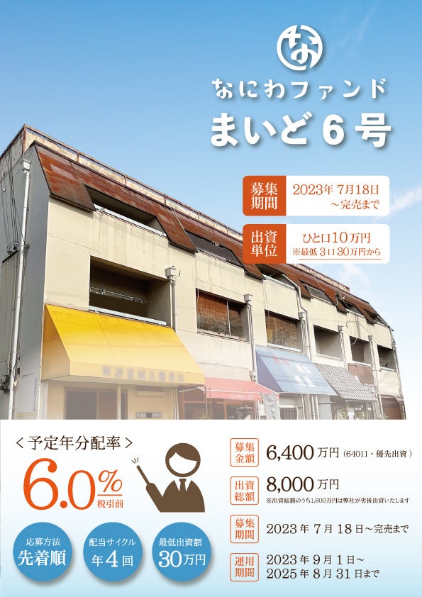 この度弊社が運営する不動産特定共同事業「なにわファンド」より、対象不動産の賃貸収入を原資に利益の分配を行う”まいどシリーズ”から、新たに『まいど6号』の募集開始が決定いたしましたので、以下の通りお知らせいたします。