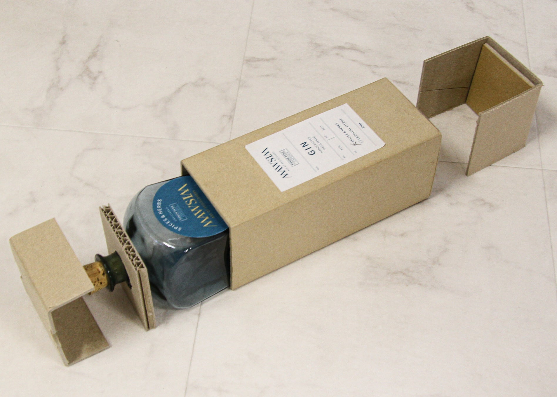 角紙管は古紙100%でリサイクル可能。環境配慮の面ではピッタリの素材です。またサイズ展開が豊富であるため「MAWSIM」の四角いボトルがぴったり収まるサイズをご用意することができました。角紙管の表面は硬くて丈夫なので、ボトルが綺麗に収まることで、余分な緩衝材を不要とすることが出来ました。天底の蓋部分には、縦向きにカットした角紙管を使用。外観を全て同素材としたことで、強度を持たせつつ、統一感のあるデザインとすることができました。そして、過剰な印刷は行わず、パッケージ本体にブランドオリジナルのステッカーを貼るものとしました。