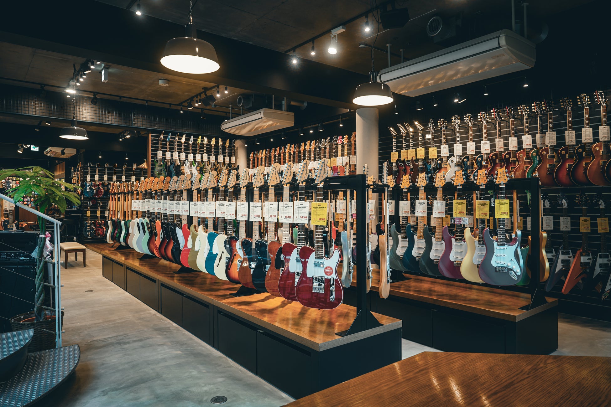 1Fフロアでは、これまでのビギナーモデルに加え、中級・高級モデルのラインナップを大幅に強化。特に、世界に誇る日本のギターブランドIbanezを筆頭に、BacchusやFujigenなどの国産ブランドギターを豊富に取り揃えています。ビギナーからプロアーティストまで、ロック、ヘヴィメタル、ジャズ、ブルースなど、あらゆるジャンルのエレキギタープレイヤーにご満足いただける圧倒的な品揃えを実現しました。さらに、エフェクター類も充実。スタッフが厳選したこだわりのラインナップを、ぜひ店頭でお試しください。